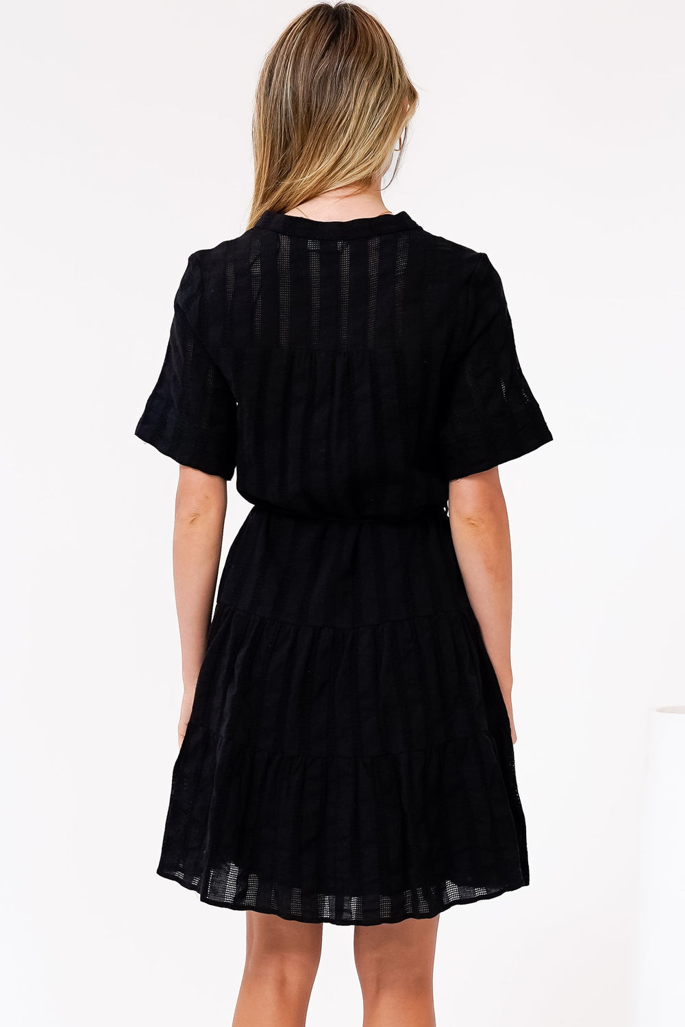 Wyanna Mini Dress - Mandarin Collar Button Down Tiered Dress with Waist Tie in Black
