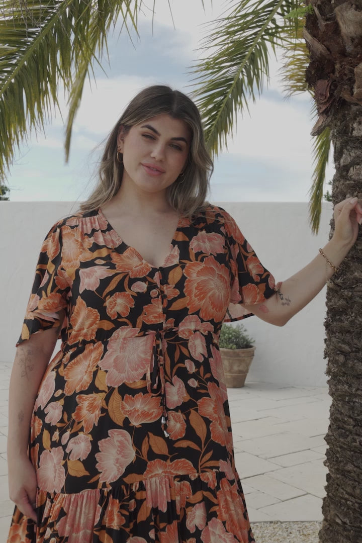 Ziggy Maxi Dress - Cap Sleeve Tiered Dress with Pull Tie Waist in Yasmin Print Black