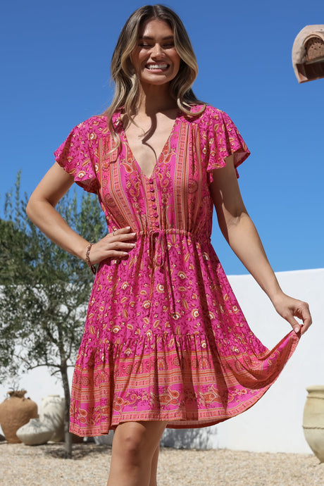 Sana Mini Dress - Bell Sleeve Button Down V Neck Dress in Rosina Print