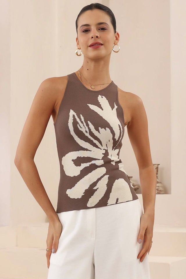 Channel a vibrant, artistic aesthetic with the Amika Knit Top, a striking piece that blends bold, abstract design with a sleek, sleeveless silhouette. This top is a statement of modern elegance, perfect for adding a touch of sophisticated drama to any outfit.