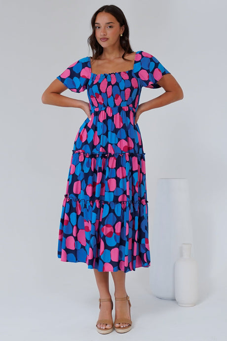 Elana Midi Dress - On or Off Shoulder Tiered Dress with Short Sleeves in Tilda Print