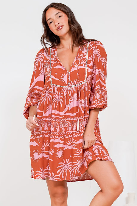 Juddy Mini Dress - Batwing Sleeve Smock Dress with Lace Detailing in Khalid Print Rust
