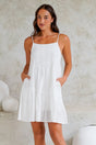 Keep your summer style simple and breezy with the Ferry Mini Dress, crafted from a textured, lightweight white fabric. This easy-to-wear piece features delicate adjustable spaghetti straps, a square neckline, and a flowing tiered silhouette for maximum comfort. Complete with essential side pockets, this mini dress is ideal for beach days or relaxed weekend wear.