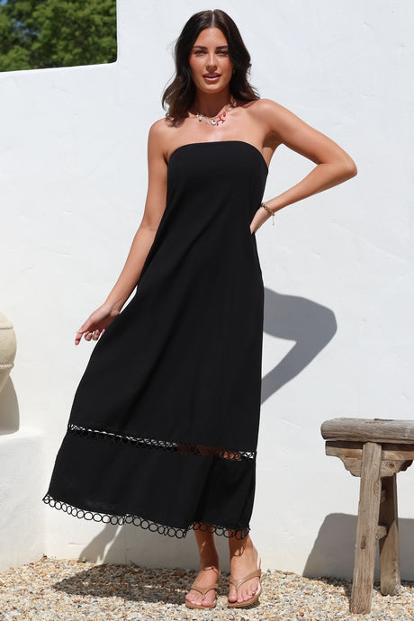 Edna Maxi Dress - Strapless A-Line Dress with Lace Insert and Trim in Black