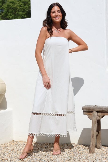 Edna Maxi Dress - Strapless A-Line Dress with Lace Insert and Trim in Cream