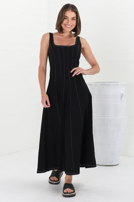 Jadely Midi Dress - Adjustable Strap A-Line Denim Sun Dress in Black