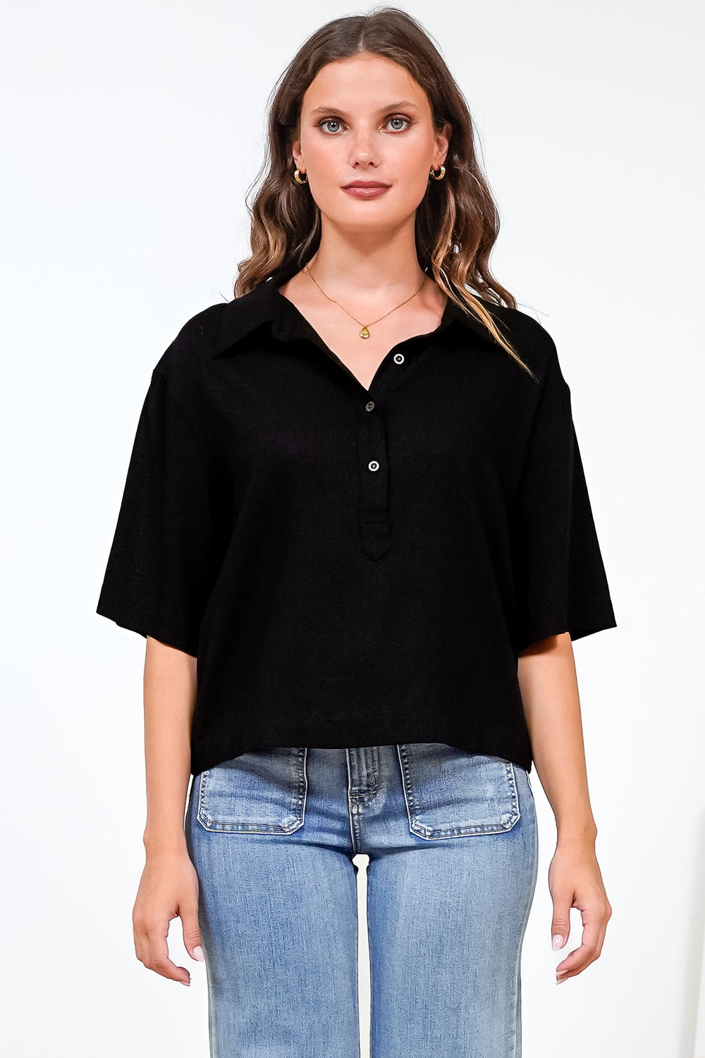 Solana Top - Collared Buttoned Neckline Boxy Tee in Black