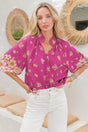 The Arden Blouse offers a gracefully relaxed silhouette with an artfully adorned hem, perfect for adding a touch of sophisticated charm to your everyday look. Its flowing design and subtle detailing evoke a sense of effortless bohemian elegance.