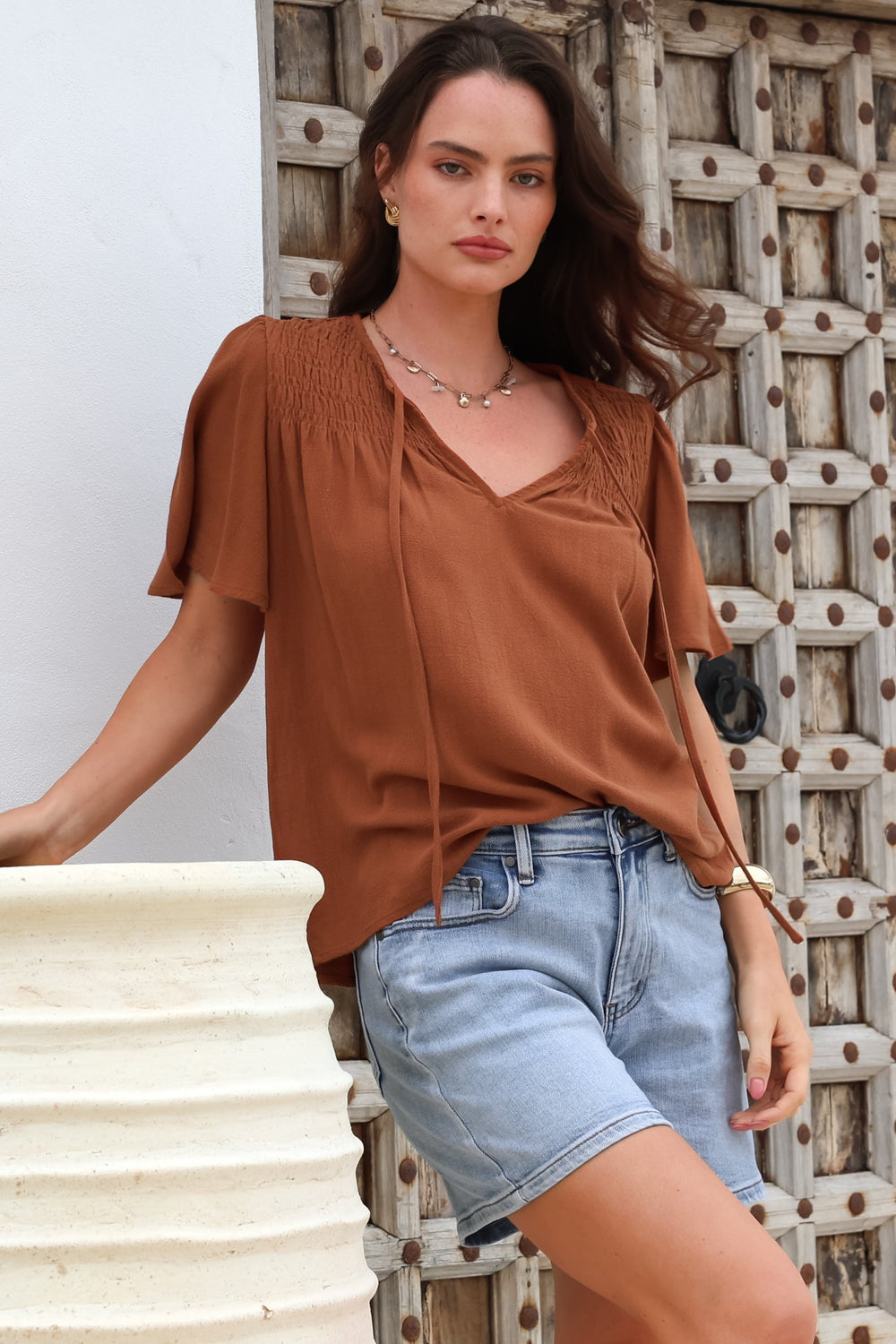 Kendra Top- V Neck Short Sleeve Top with Necktie in Tan