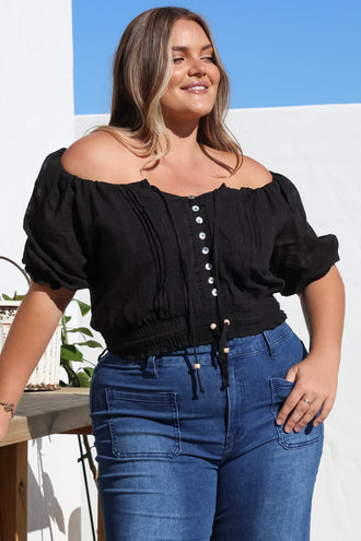 Catha Top - Frill Neckline Empire Bustline Top with Short Balloon Sleeves in Black