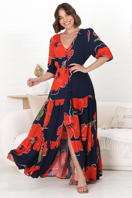 Embrace effortless elegance with the Anya Maxi Dress, featuring a flattering v-neckline, buttoned bodice, and a pull-tie waist that flows into a tiered skirt with a modest front split - perfect for adding a touch of sophistication to your every step.