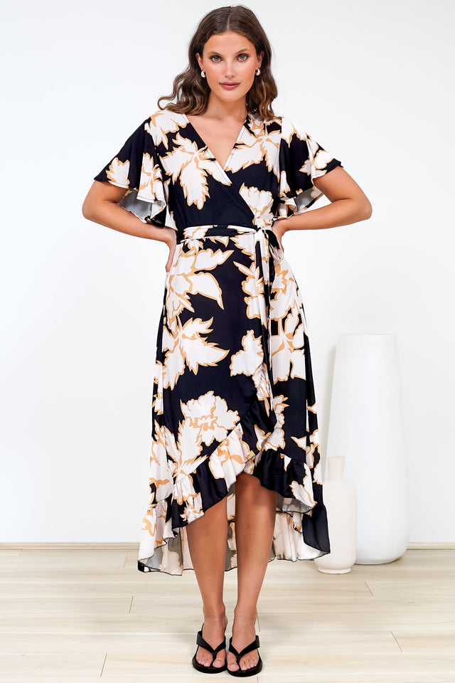 Carolina Midi Dress - V Neck Wrap Dress with Ruffle High Low Hemline in Black