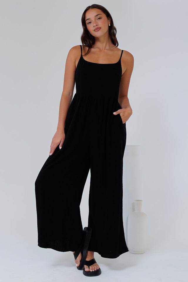 Effortless, chic, and endlessly wearable this black wide-leg jumpsuit is your new go-to for everyday comfort. Designed with a soft, lightweight fabric, it features slim adjustable straps and a gently gathered waist for a flattering, relaxed silhouette. The roomy wide legs create beautiful movement, while the side pockets add practical functionality. Dress it up with wedges or keep it casual with sandals for an easy, versatile look you’ll reach for again and again.