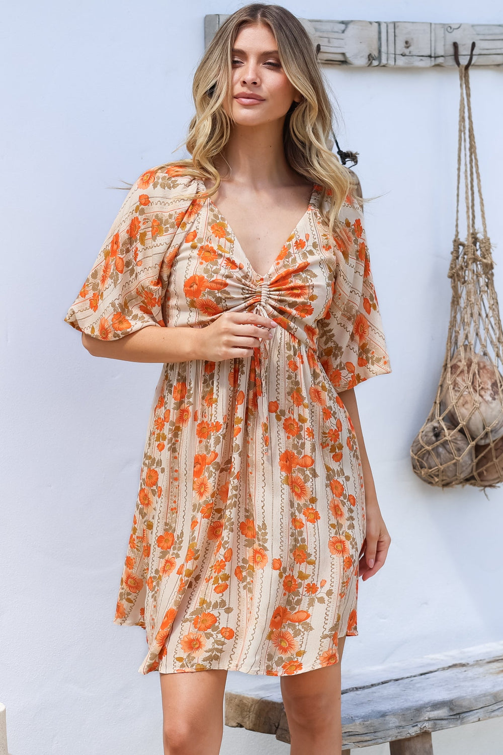 The Yanna Mini Dress offers a versatile on or off-shoulder design with a soft v-neckline, short balloon sleeves, and a flattering pull-tie waist. Its flowing a-line silhouette and elasticated back create a dreamy, effortless look for any occasion.