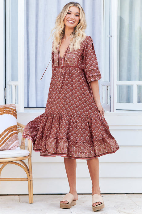 We love our Carmen Maxi Dress - Coral Eden Print. This stunning style features beautiful and feminine cap sleeves, an elasticated waistband and cute crochet detailing in the bottom panel of the dress.