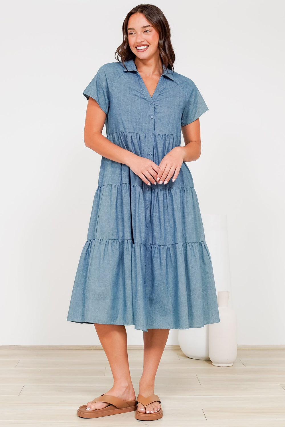 Hailey Midi Dress - Collared Tiered Button Down Dress in Light Chambray