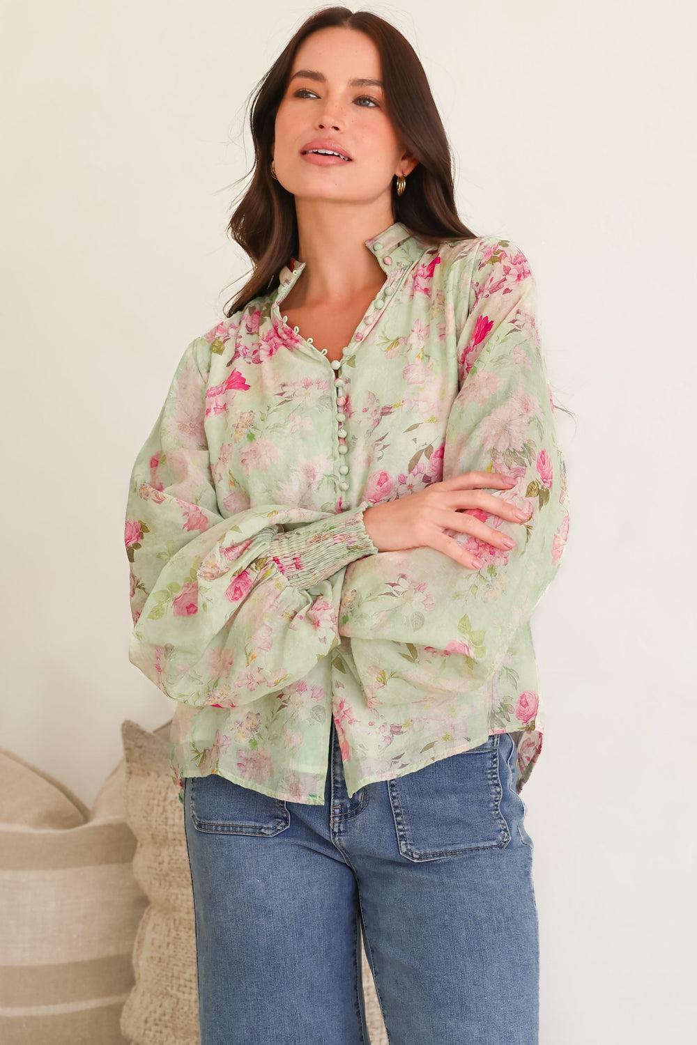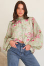 Faye Blouse - Mandarin Collar Balloon Sleeve Button Down Shirt in Rosemarie Print