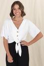 Indulge yourself in the Lanara Top and discover the magic it adds to your wardrobe. The Lanara Top gracefully ties at the waist, accentuating your natural curves, cute buttons adorn the front, and let's not forget about the sleeves!