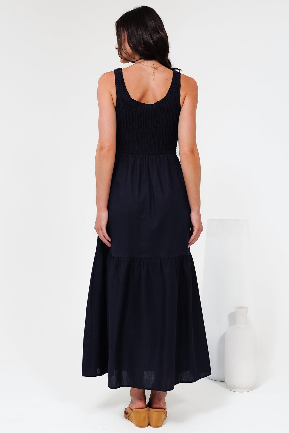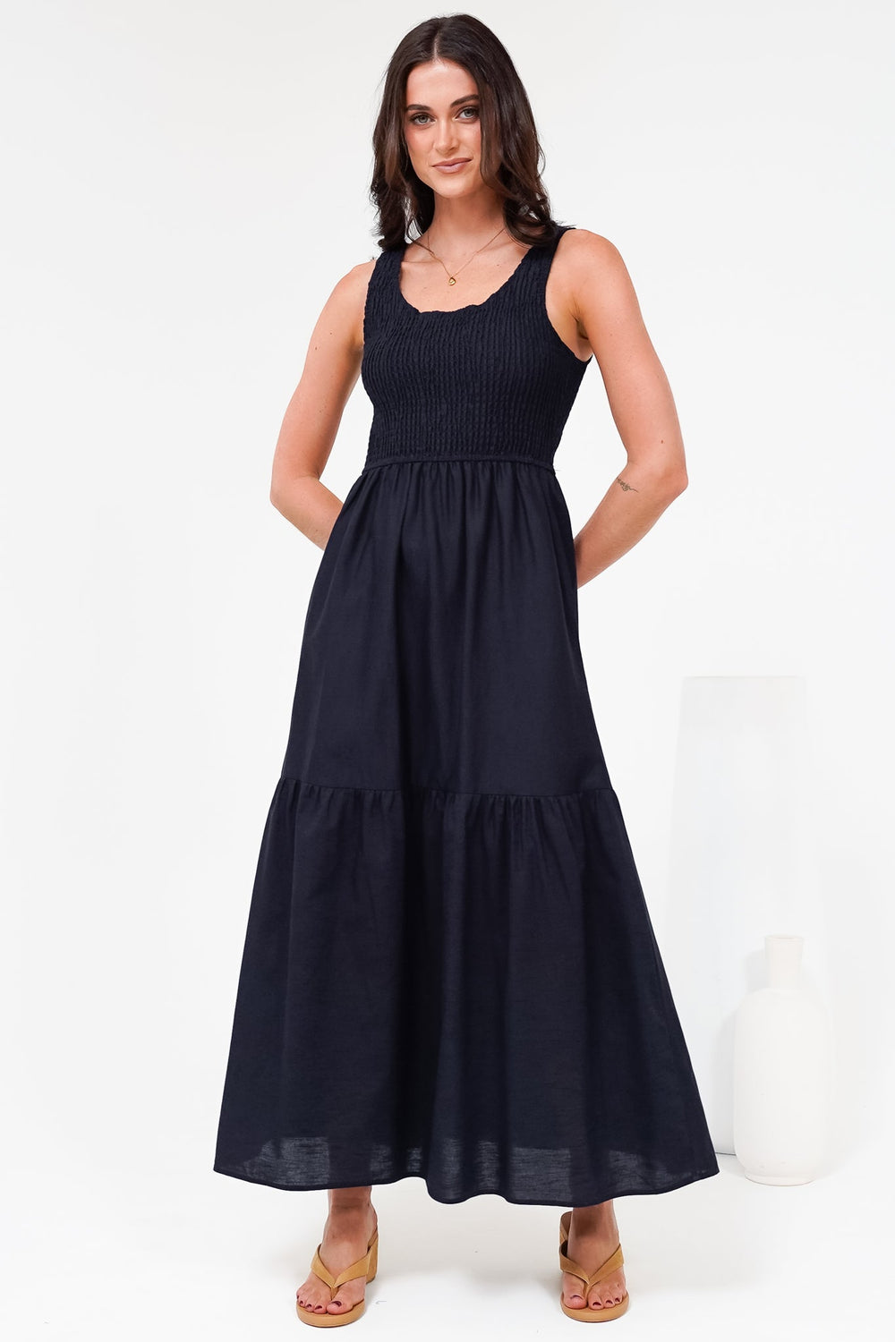 Sarlita Midi Dress - Shirred Bodice Sleeveless Tiered Dress with Pockets in Navy