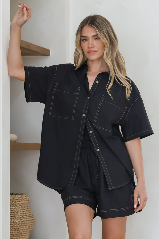 Steele Shirt - Collared Button Down Shirt with Contrast Stitching in Black