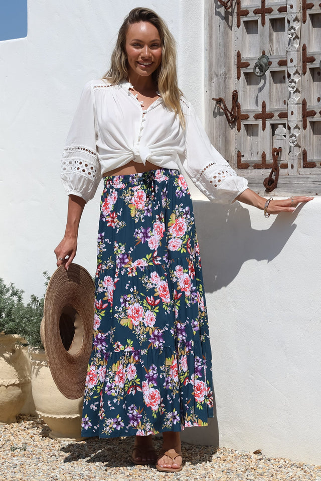 Lucien Maxi Skirt - High Waisted Tiered Skirt in Virginia Print Navy