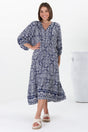 Kamali Midi Dress - Batwing Sleeve Smock Dress with Lace Detailing in Thanya Print Blue