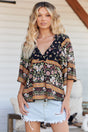 • JAASE - Gabriella Top: Mandarin Collar Deep V Neck Crochet Trim Top in Cedella Print