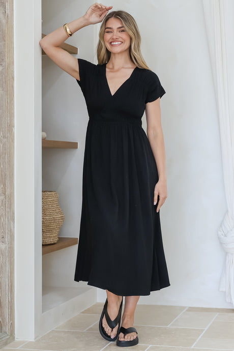 Torin Midi Dress - Gathered and Piping Detailed A-Line Dress with a V-Neckline in Black