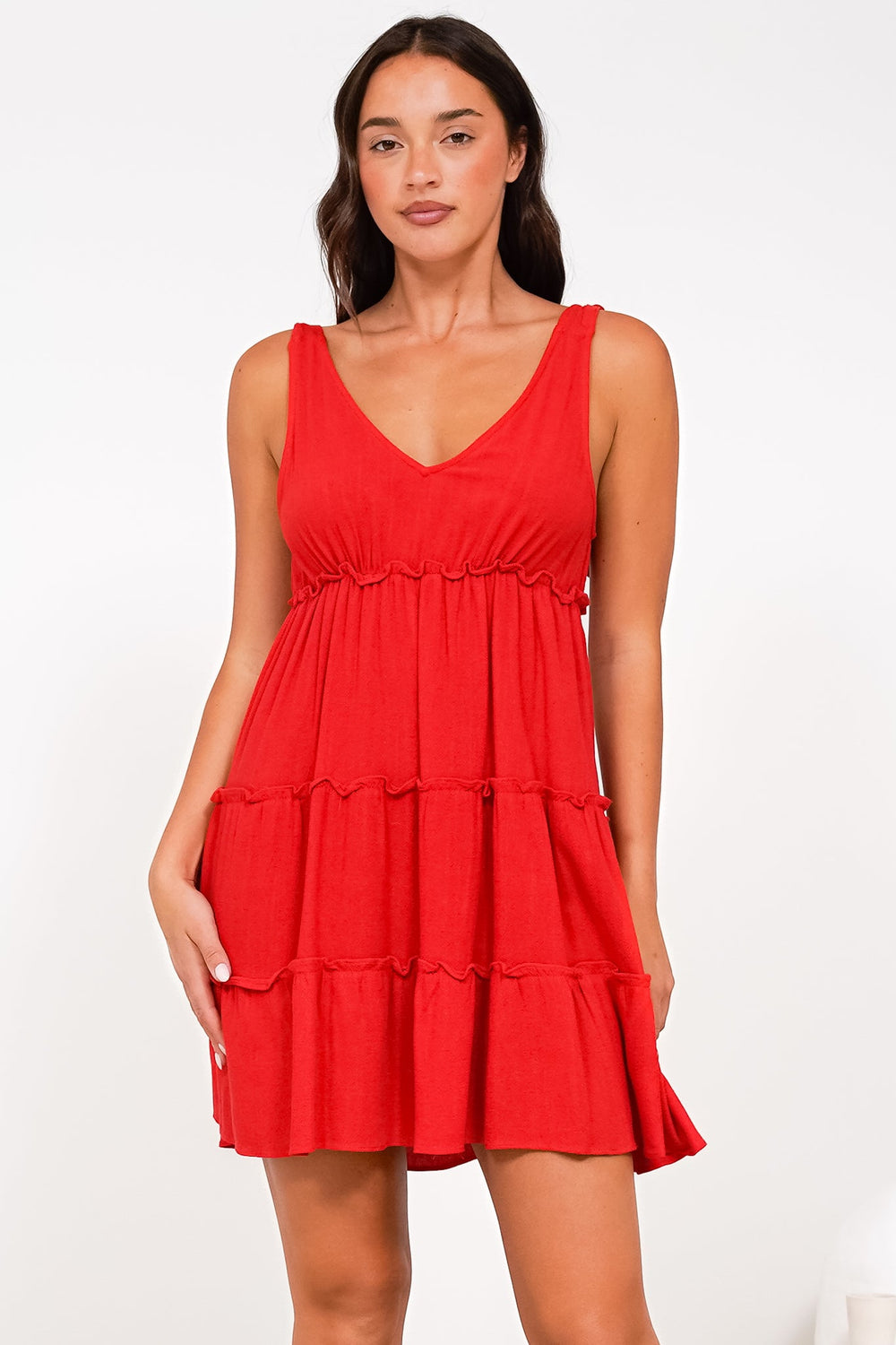 Lacy Mini Dress - Tie on Shoulder Strap Frill Splicing Tiered Sun Dress in Red
