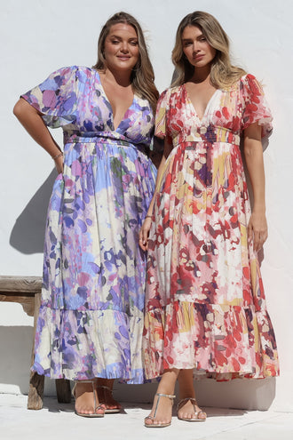 Payton Maxi Dress - Pleat Detailed A-Line Dress with Cap Flutter Sleeves in Leonor Print