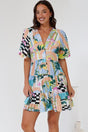Sana Mini Dress - Bell Sleeve Button Down V Neck Dress in Melora Print