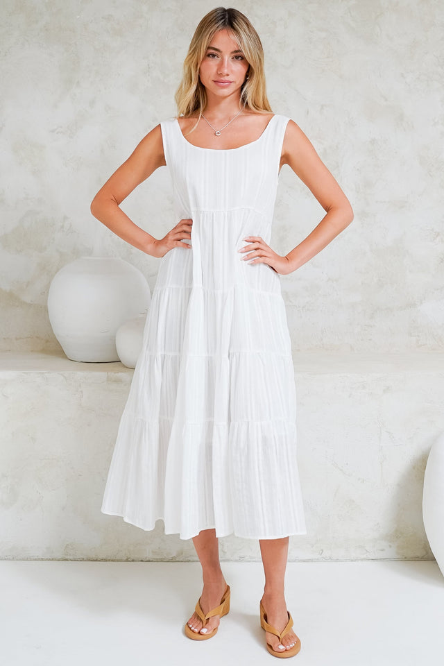 Pina Midi Dress - Scoop Neck Textured Cotton Sun Dress in White
