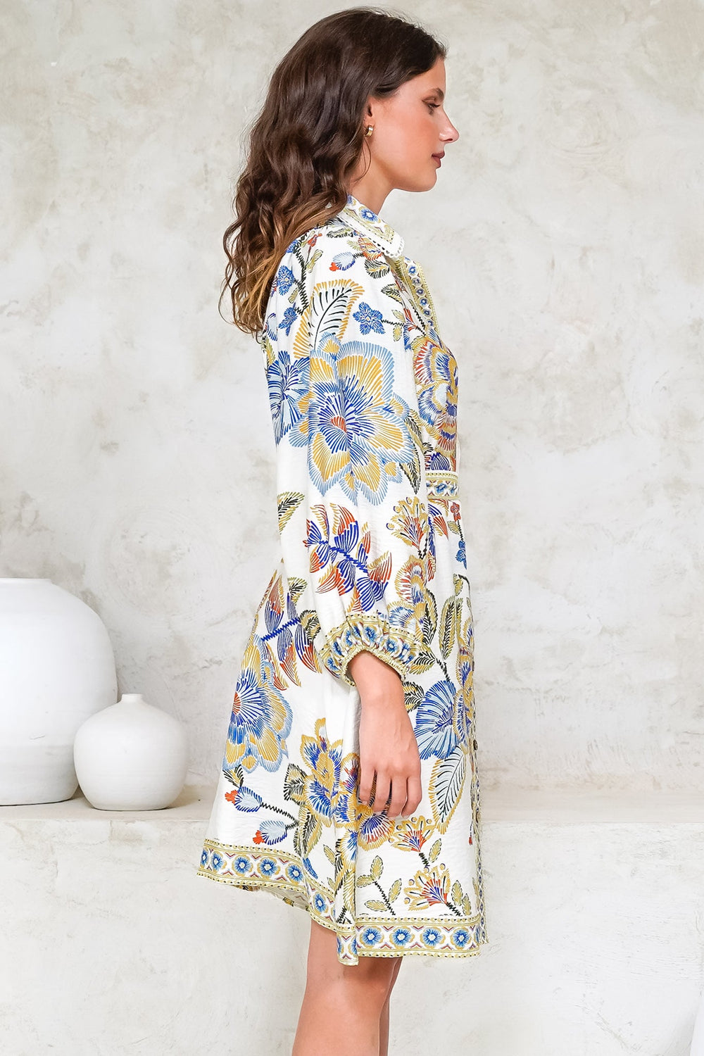 Francini Mini Dress - Collared Shirt Dress with Matching Belt in Elle Print White