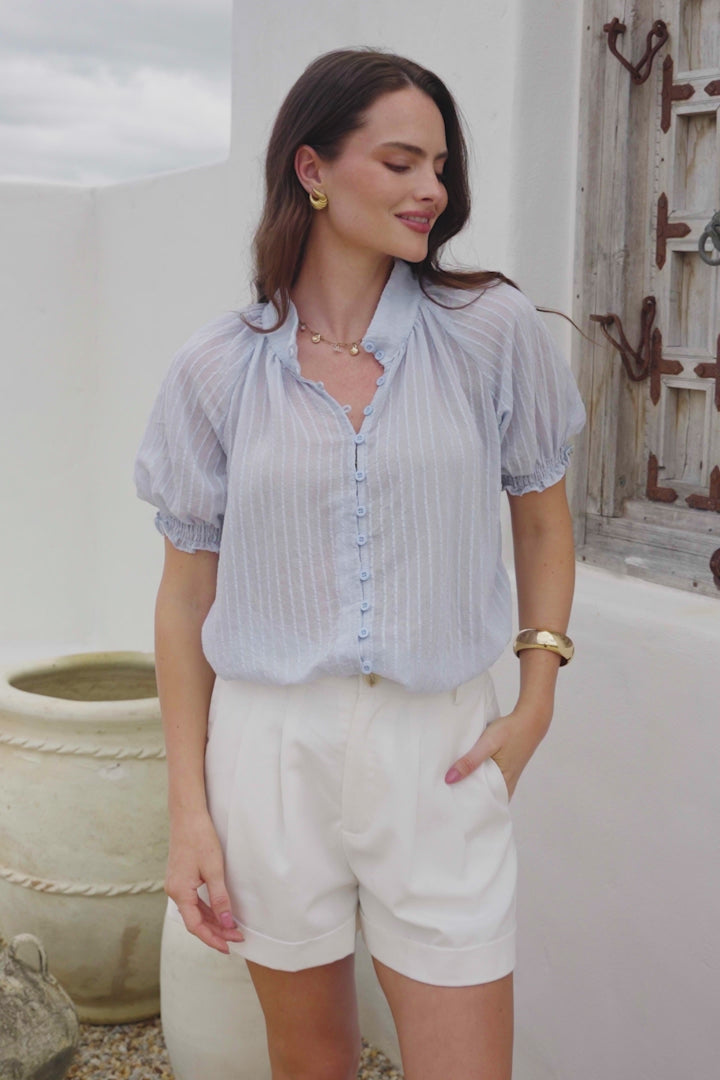Luella Shirt - Subtle Textured Stripe Button Down with Puff Sleeves in Blue