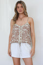 The Bambini Top is the perfect blend of boho charm and everyday ease. With its delicate lace trim, button-down front, and lightweight flowy fabric, this strappy cami is ideal for warm days and effortless layering.