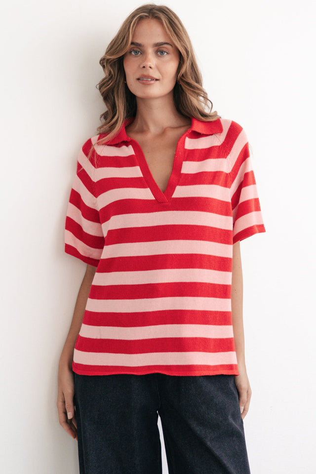Hayes Stripe Knit Top - Relaxed Collared V Neck Knit Top in Pink/Red