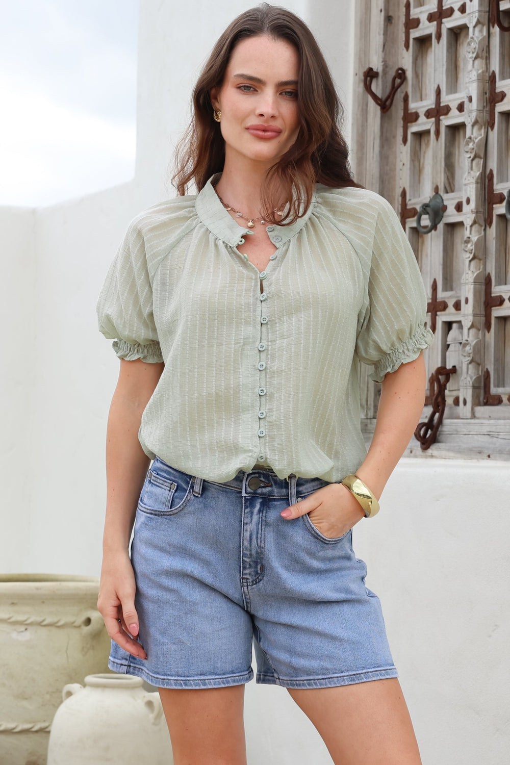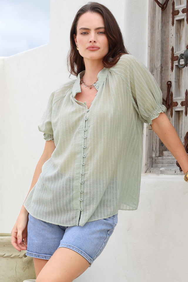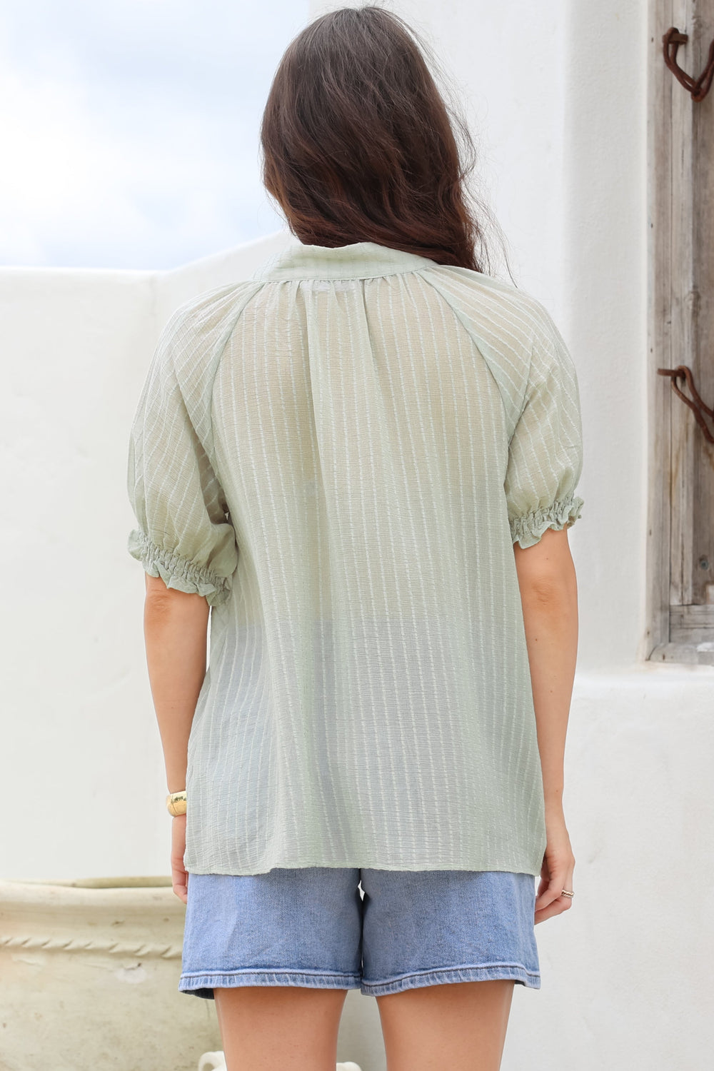 Luella Shirt - Subtle Textured Stripe Button Down with Puff Sleeves in Mint