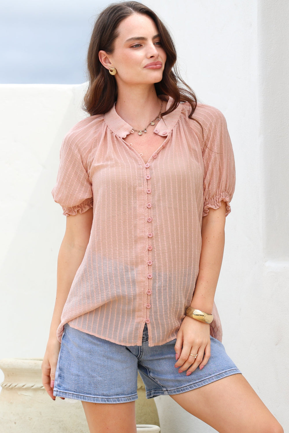 Luella Shirt - Subtle Textured Stripe Button Down with Puff Sleeves in Pink