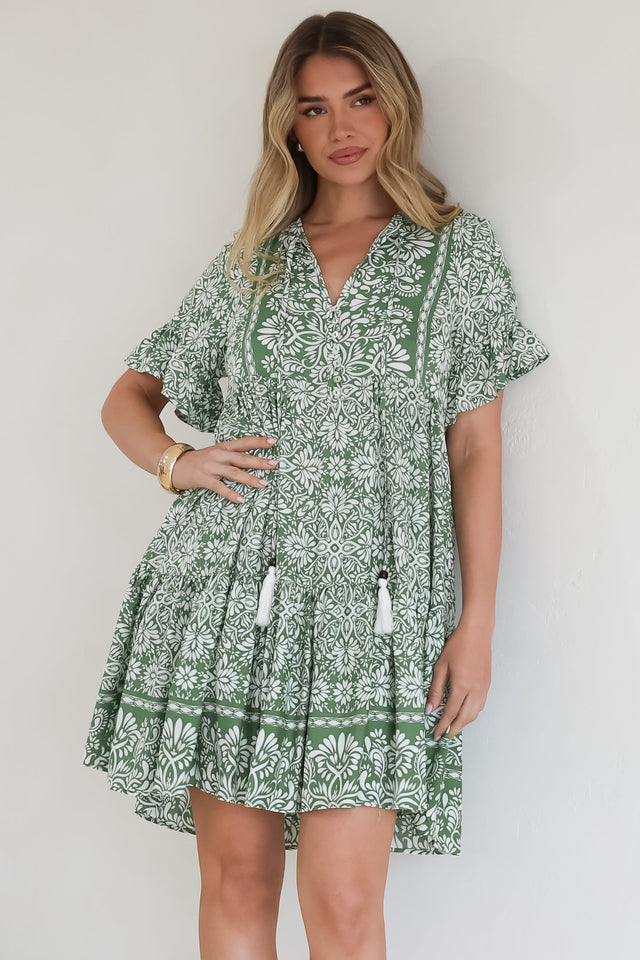 Abilia Mini Dress - Mandarin Collar Smock Dress in Harley Print Green
