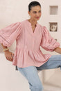 Alberta Blouse - Mandarin Collar Cut Out Embelished Balloon Sleeve Top in Pink