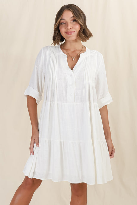 Evie Mini Dress - 3/4 Sleeve Tiered Smock Dress in Jeani Print Beige