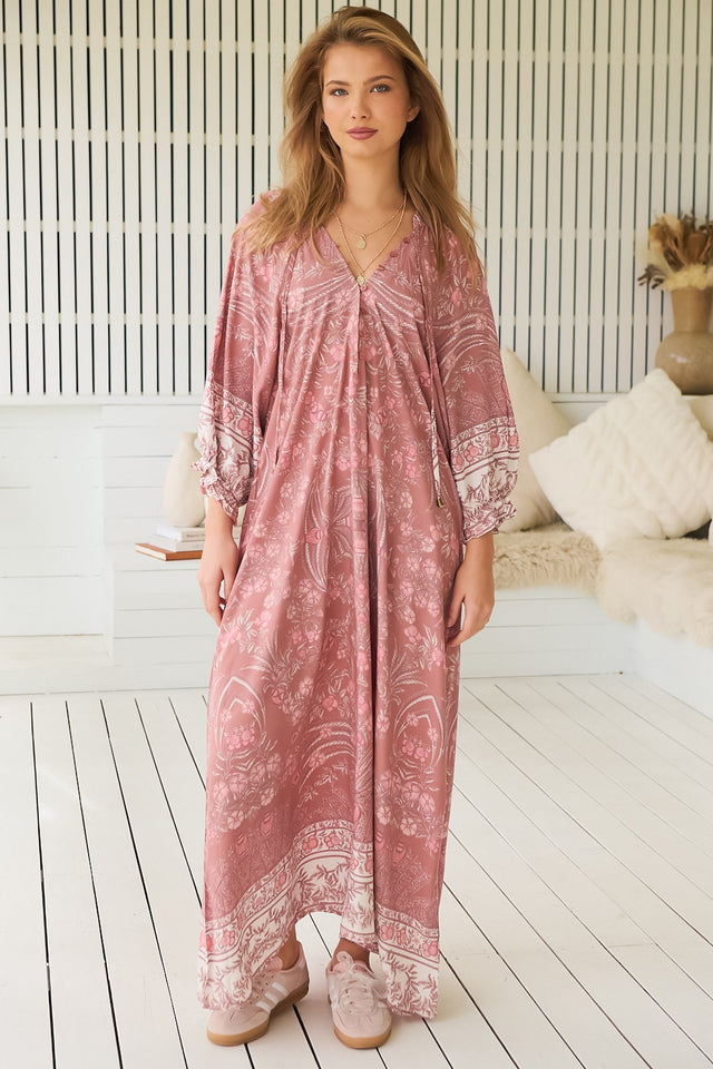 JAASE - Bree Maxi Dress: Frill Balloon Sleeve V Neck Shift Dress in Angelina Print