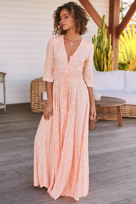 JAASE - Carmen Maxi Dress: Butterfly Cap Sleeve Button Down A Line Dress with Lace Trim in Peach Island Print