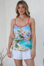 The Micaela Top brings a touch of tropical paradise to your wardrobe. With its vibrant beach-inspired print, soft lightweight fabric, and delicate contrast trim, this cami is perfect for sunny days and effortless vacation styling.