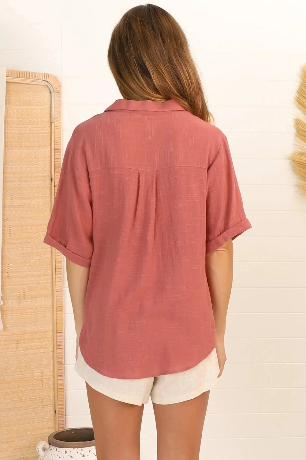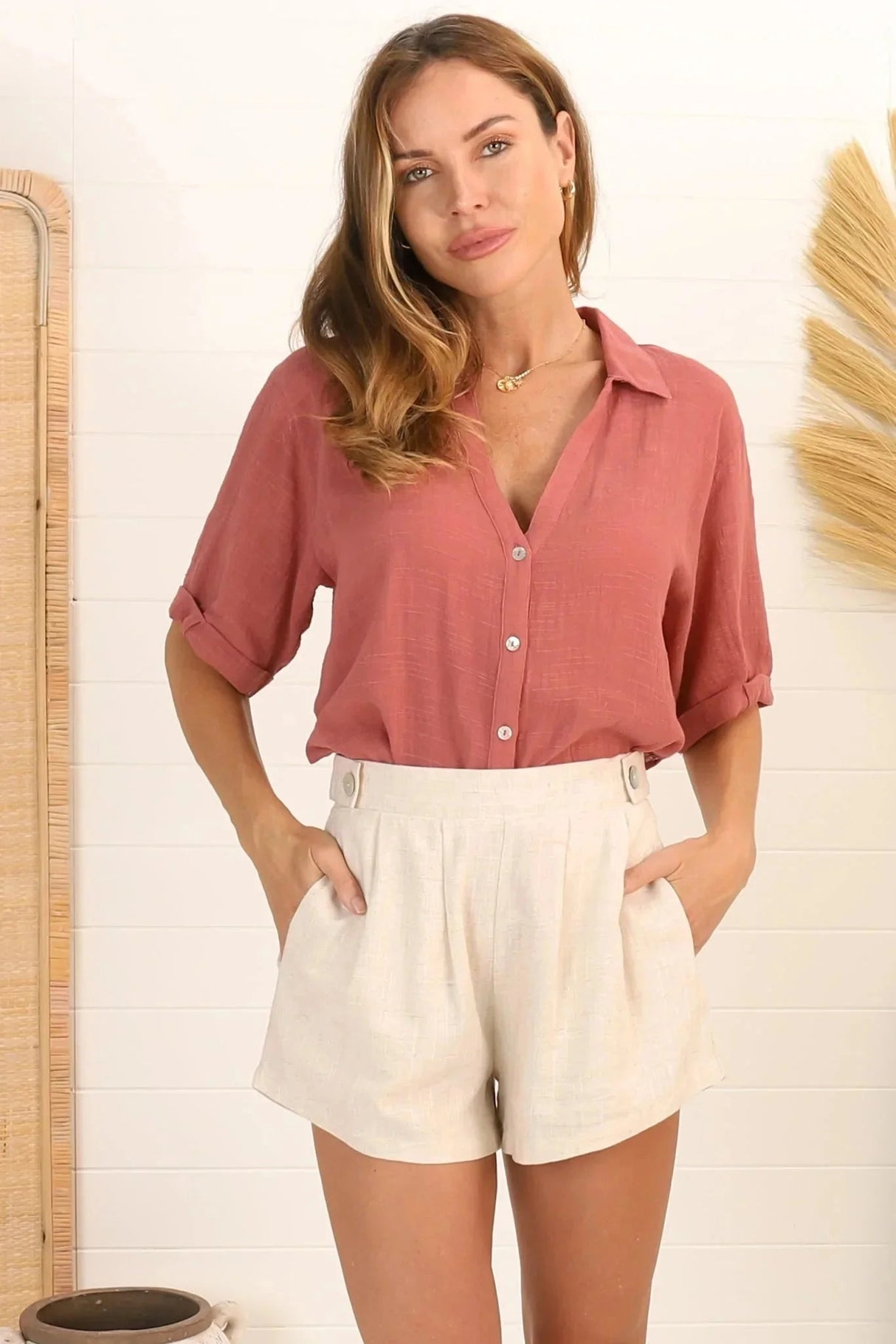 Shelly Shirt - Linen Collared Button Down Shirt in Guava