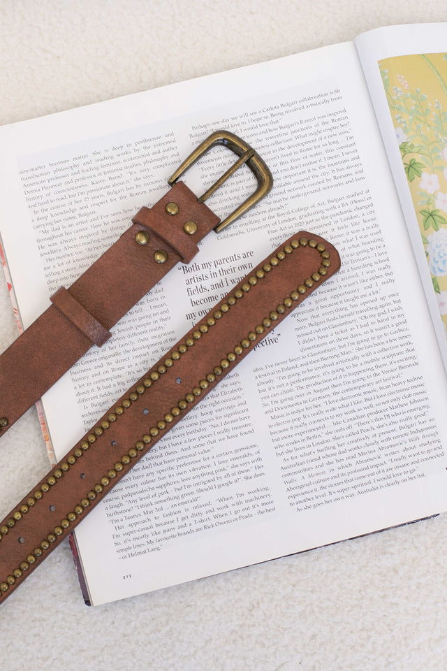 Jace PU Leather Gold Buckle Studded Belt - Brown