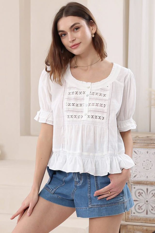 Elevate your everyday style with the Selma Top, a charming blouse that features a relaxed, peasant-inspired silhouette. The delicate pintucks and tiered ruffles give it a romantic, bohemian feel.