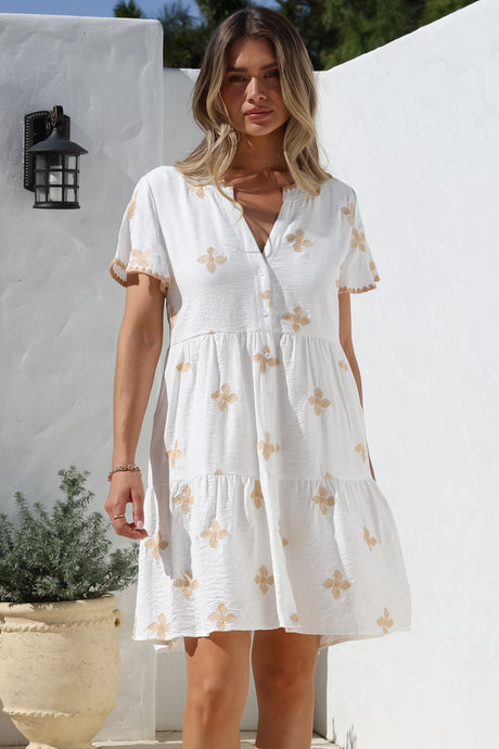 Wilma Mini Dress - Bermuda Collar Button Down Dress with Cap Sleeves in Gigi Print White