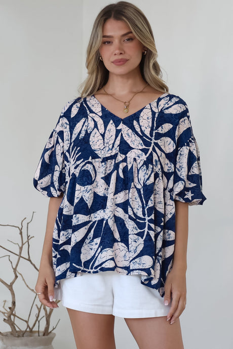 JAASE - Palas Top: V Neck Slouch Blouse with Criss Cross Bust Tie In Denim Dreams Print