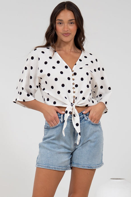 Waverly Top - V-Neck Button Down Top with Tie at Waist in Black Polka Dot Print